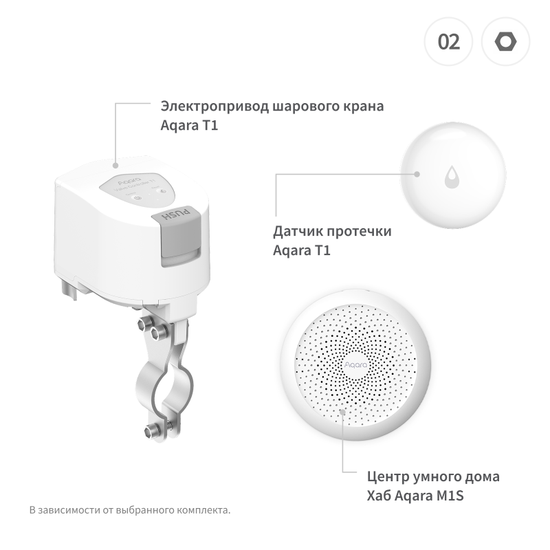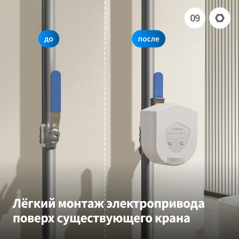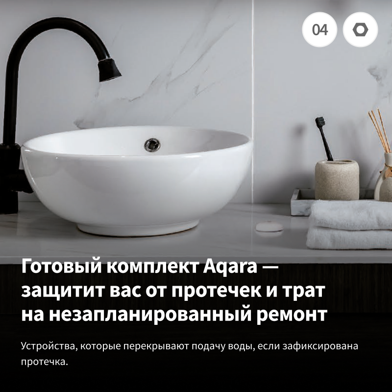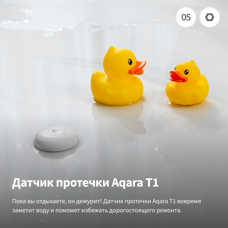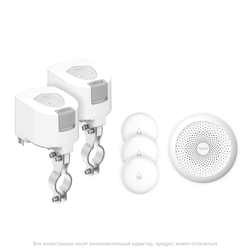 Комплект Aqara обеспечивает автоматическую защиту от протечек воды. При обнаружении утечки система мгновенно перекрывает подачу воды и уведомляет пользователя через приложение. Устройства быстро устанавливаются и не требуют сложного монтажа.