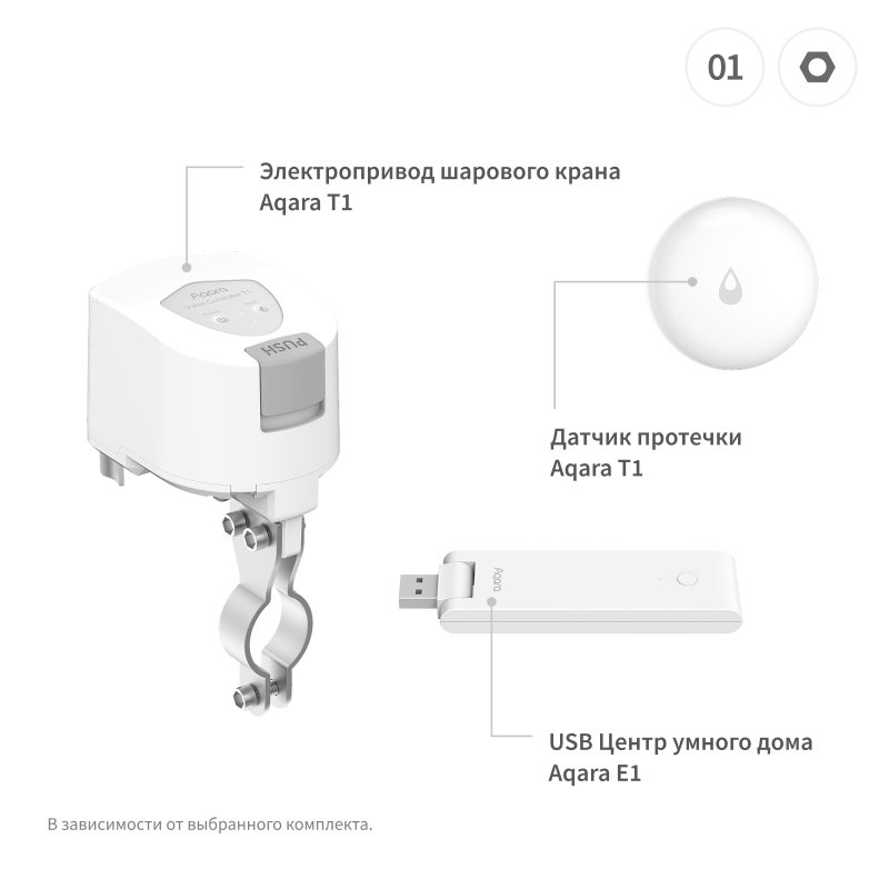 Комплект предназначен для предотвращения затоплений в жилых и коммерческих помещениях. Он включает в себя: