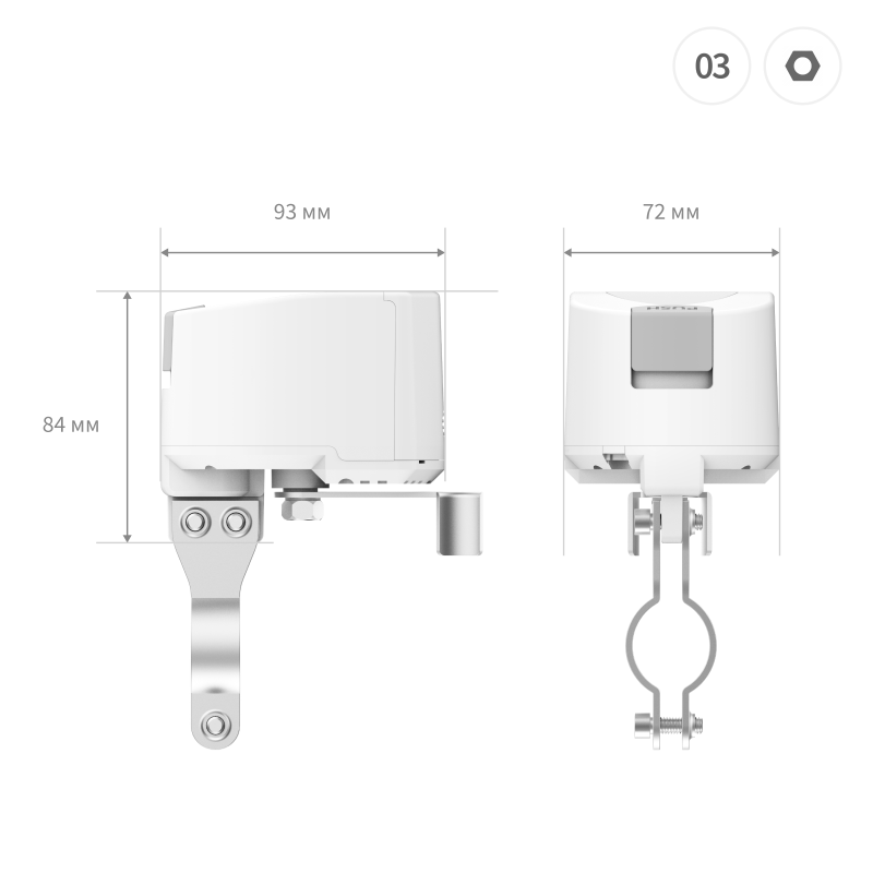 Установка датчика протечки осуществляется на ровную поверхность в местах потенциальных утечек. Электропривод монтируется на водопроводный кран с помощью стандартных фитингов. Хаб E1 подключается к USB-порту для питания.