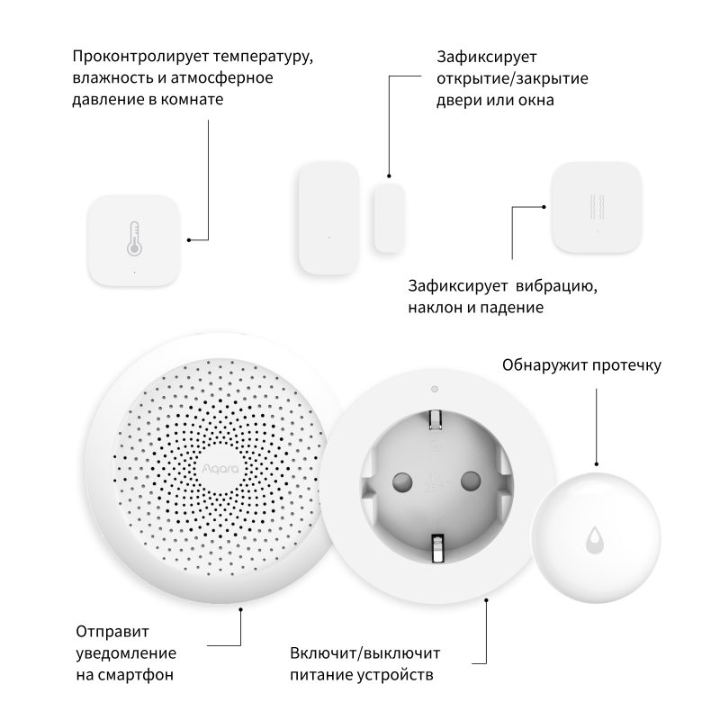 Выключайте свет из кровати, узнайте вовремя о протечке или включите обогреватель, пока едете на дачу. В комплекте — главные устройства Умного дома Aqara. Он подойдет как для знакомства с новой технологией, так и для подарка знакомым и близким. Комплект продается по специальной цене.